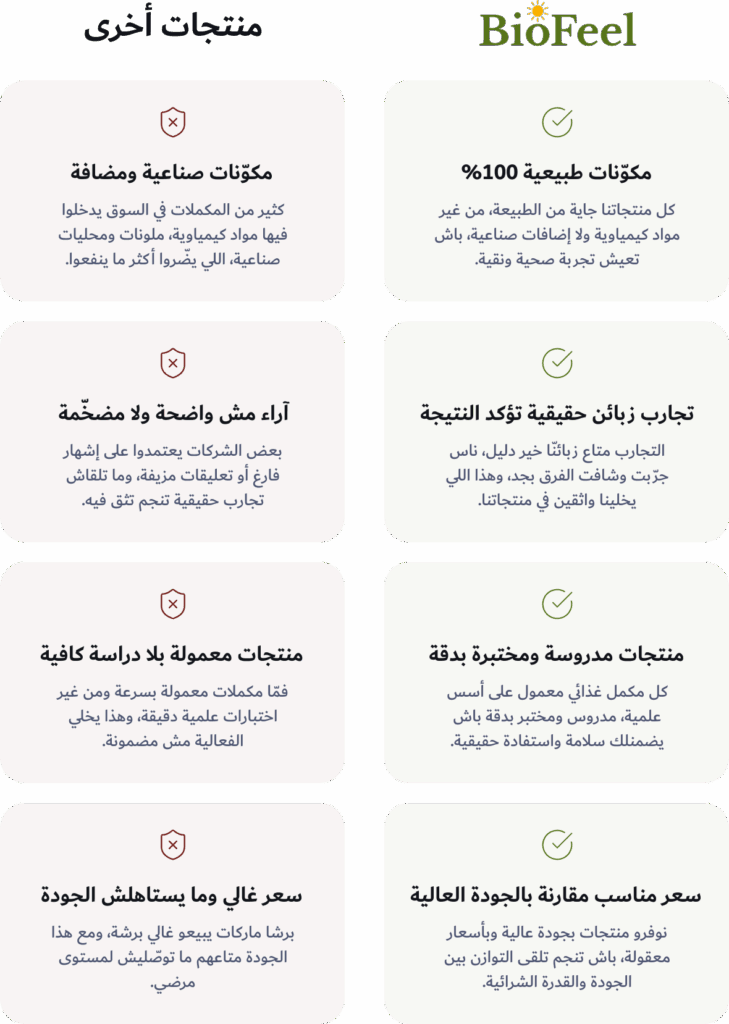 لذلك، مجموعة الباحثين والصيادلة بـ Biofeel حولوا هالإيمان لحلول واضحة وفعّالة، مبنيّة على العلم والدقّة.